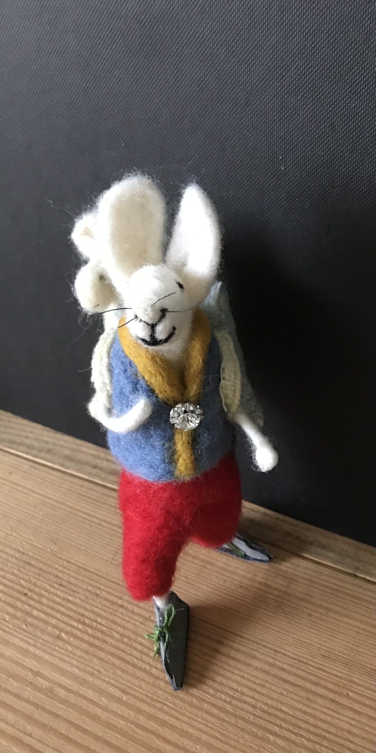 Let op de lieve details; rugzakje gemaakt van een wollendeken, prachtig zilveren knoopje en leren schoentjes. Een feest om weer te maken, een prachtig pronkstuk in je kast of op bijzonder plekje in huis. Hoogte ong. 18,5 cm.