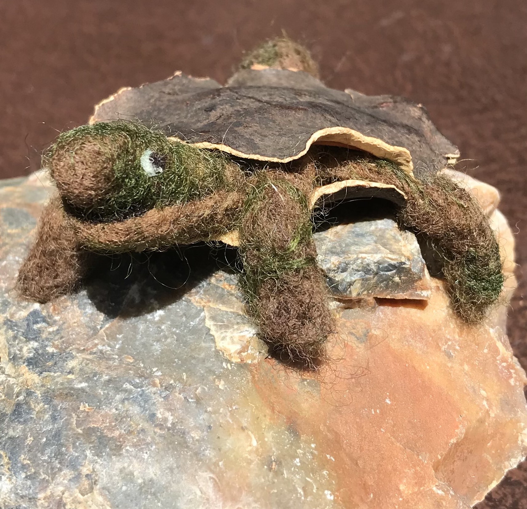 Ondeugende Elmer. Lief schildpadje. Handgemaakt; Naaldvilten techniek. Elmer is gemaakt van natuurlijke producten; Zijn schild is een verdroogde schors, gevonden in het bos. Zijn lijfje is van 100% wol in de mooie natuurlijke kleuren.